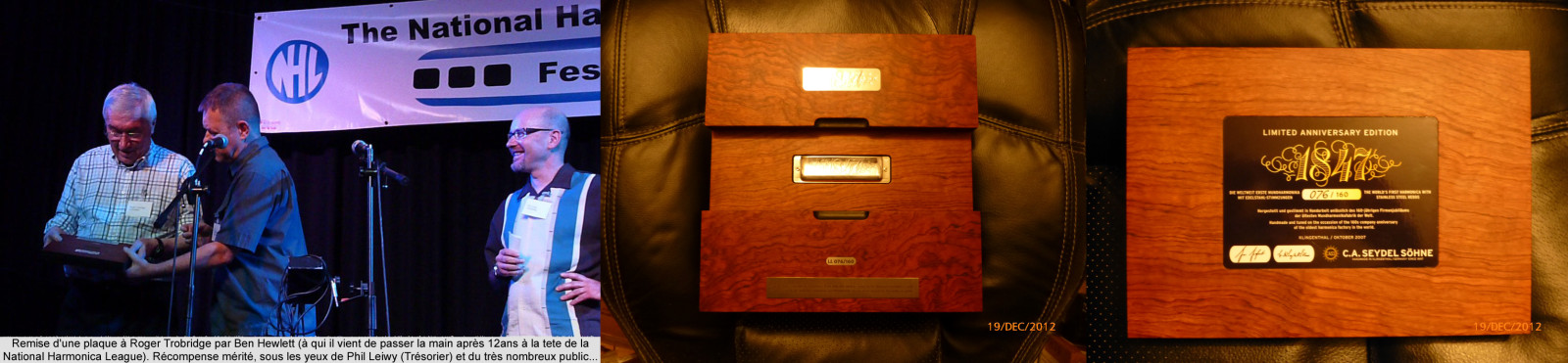 Le grand concert a débuté par la performance d'un sextet d'harmonicistes nord-coréens, qui jouaient ensemble depuis un an et quatre mois. Extraordinaire ! J'ai beaucoup pensé à la majorité des membres de la NHL, qui pour beaucoup ont connu les années fastes. Même les anciens Britanniques étaient unanimes: Incroyable ! Je n'ai pas manqué de remarquer deux détails : L'un d'eux monté sur scène avec son gros anorak pour chauffer son polyphonia ... Les autres mettant la tirette en bouche et soufflant pour chauffer aussi le mécanisme. Ils étaient filmés par un cameraman autrichien, accompagné par Isabella Krapf, leur professeur à l'occasion d'un reportage retraçant leur parcours. Ils devaient prendre un avion juste après leur concert, juste après avoir reçu des médailles de la part des Britanniques. La récompense la plus commentée et applaudie fut cependant celle, bien méritée, remise à Roger Trobridge. Roger venait de passer la main, après 12 années pleines à la tête de la « National Harmonica League » à l'assemblée générale de la veille. La récompense était une très belle boîte en bois contenant un des tous premiers Harmonicas Seydel 1848 avec anches en inox ! L'un des touts premier du genre dont la série fût limité à 160 exemplaires... Sur la plaque, on pouvait lire gravé «For Dr Roger Trobridge in recognition of his long and sterling service to the national Harmonica League and grateful thanks from the committee and Membership that he never played the harmonica in public » : Pour Dr Roger Trobridge en reconnaissance de son long service et valeureux pour la National Harmonica League et en remerciements reconnaissants du comité et des membres du fait qu'il n'ait jamais joué de l'harmonica en public. Comme quoi l'humour anglais est à la fois excellent et solide...